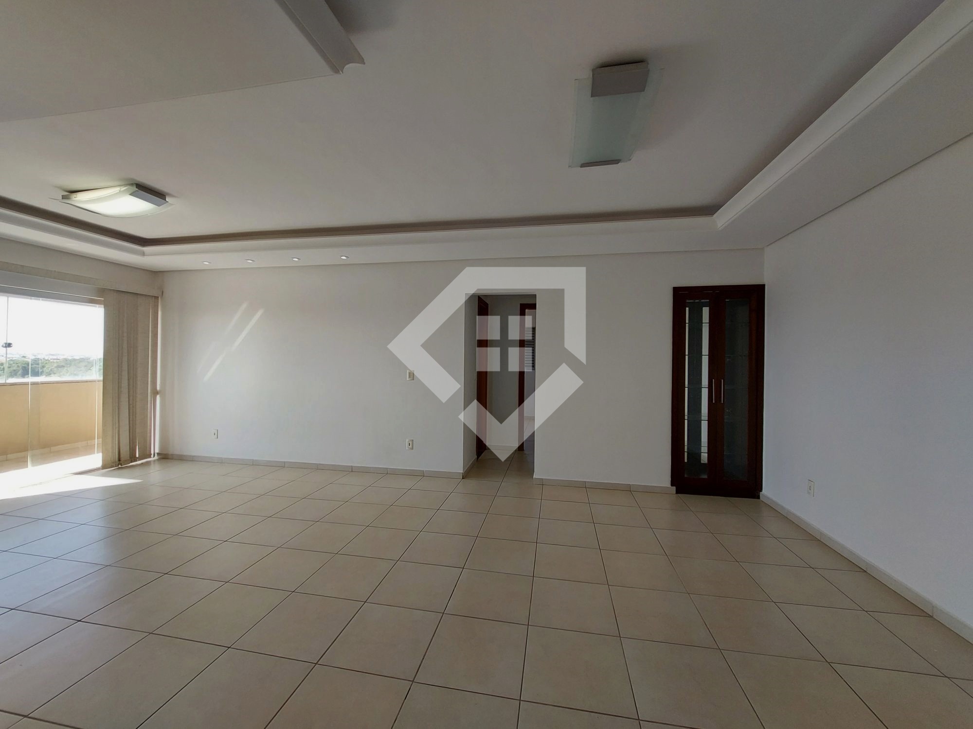 Apartamento a venda em Mineiros com três quartos sendo um suíte, ampla sala para ambiente de jantar e TV, varanda gourmet com churrasqueira a carvão, cozinha completa, com armários, forno, fogão e coifa, área de serviço independente, banheiro social e garagem coberta e individuais para dois carros.