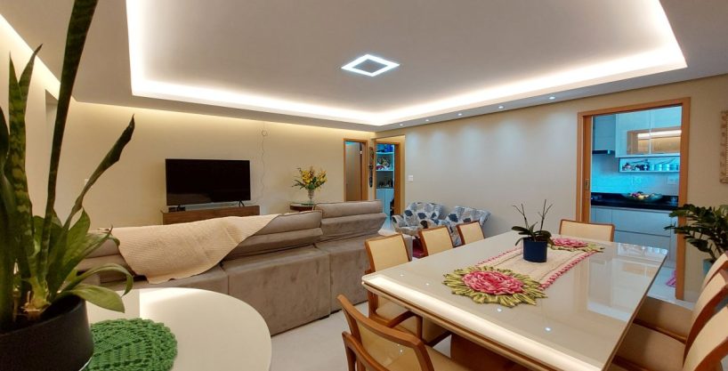 apartamento a venda em mineiros, com três suítes, living com para salas de TV e jantar, cozinha com armários, fogão, coifa e forno, área de serviço independente, lavabo, escaninho no pavimento com armários, podendo ser convertido em office e duas vagas de garagem individuais. Teto com rebaixamento em gesso, iluminação em LED, cortinas, guarda roupas nas 3 suítes, apartamento mobiliado e pronto para morar. O lazer do condomínio conta com lobby imponente, guarita com pulmão de segurança, academia equipada, dois salões de festas mobiliados e com churrasqueiras, cozinha, playground, piscina adulto e infantil com deck.