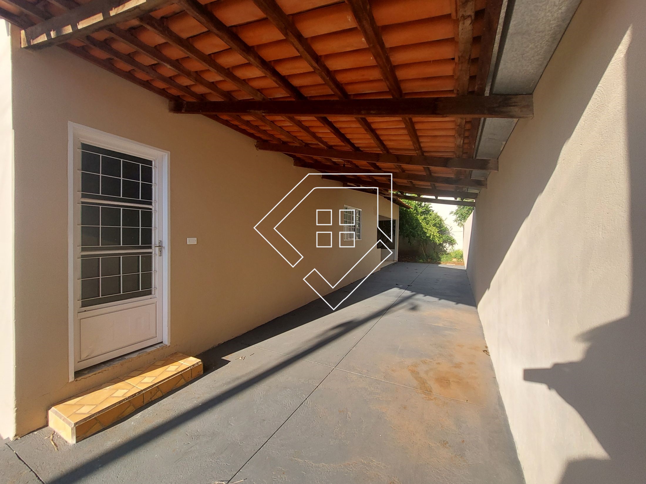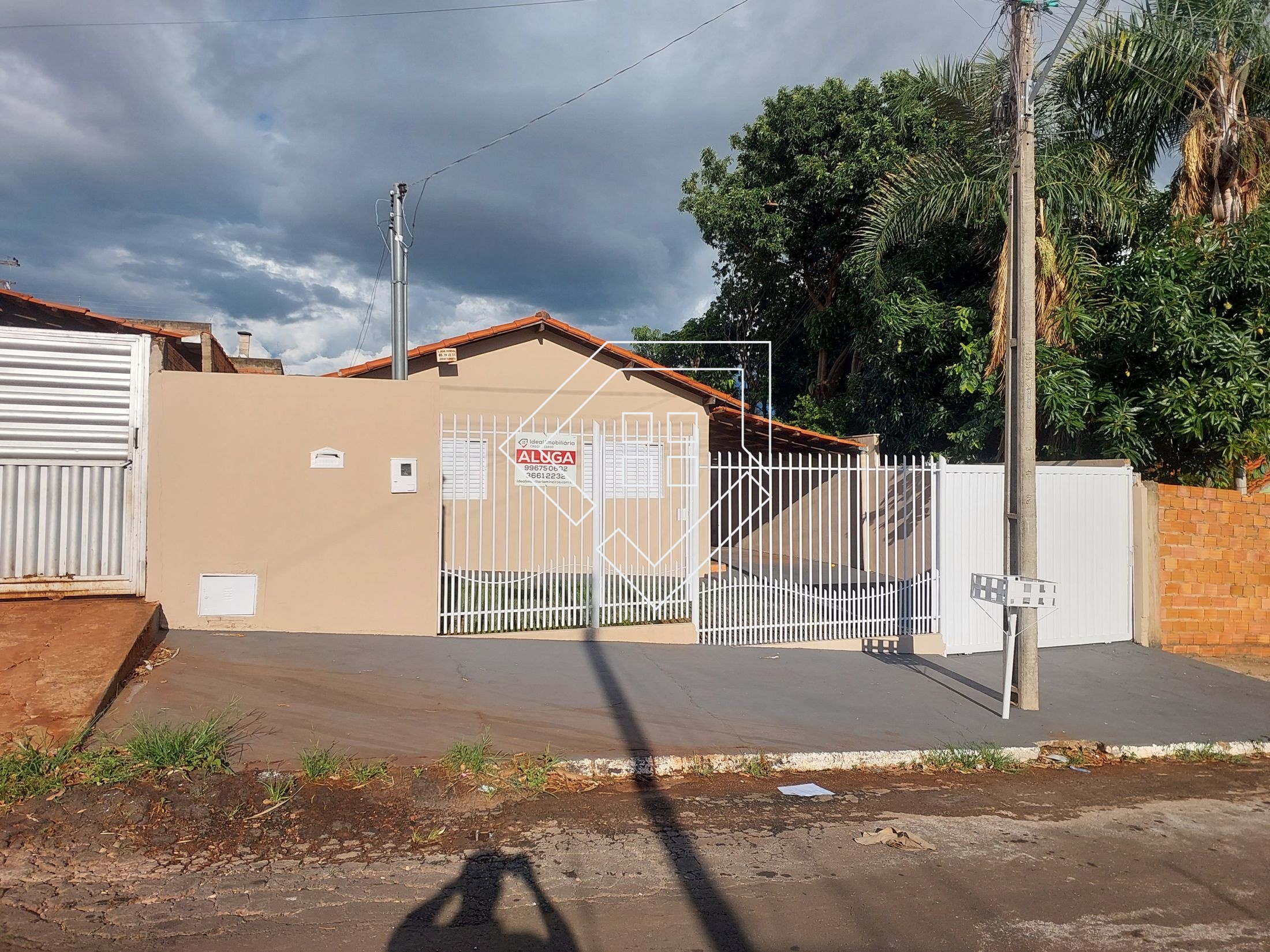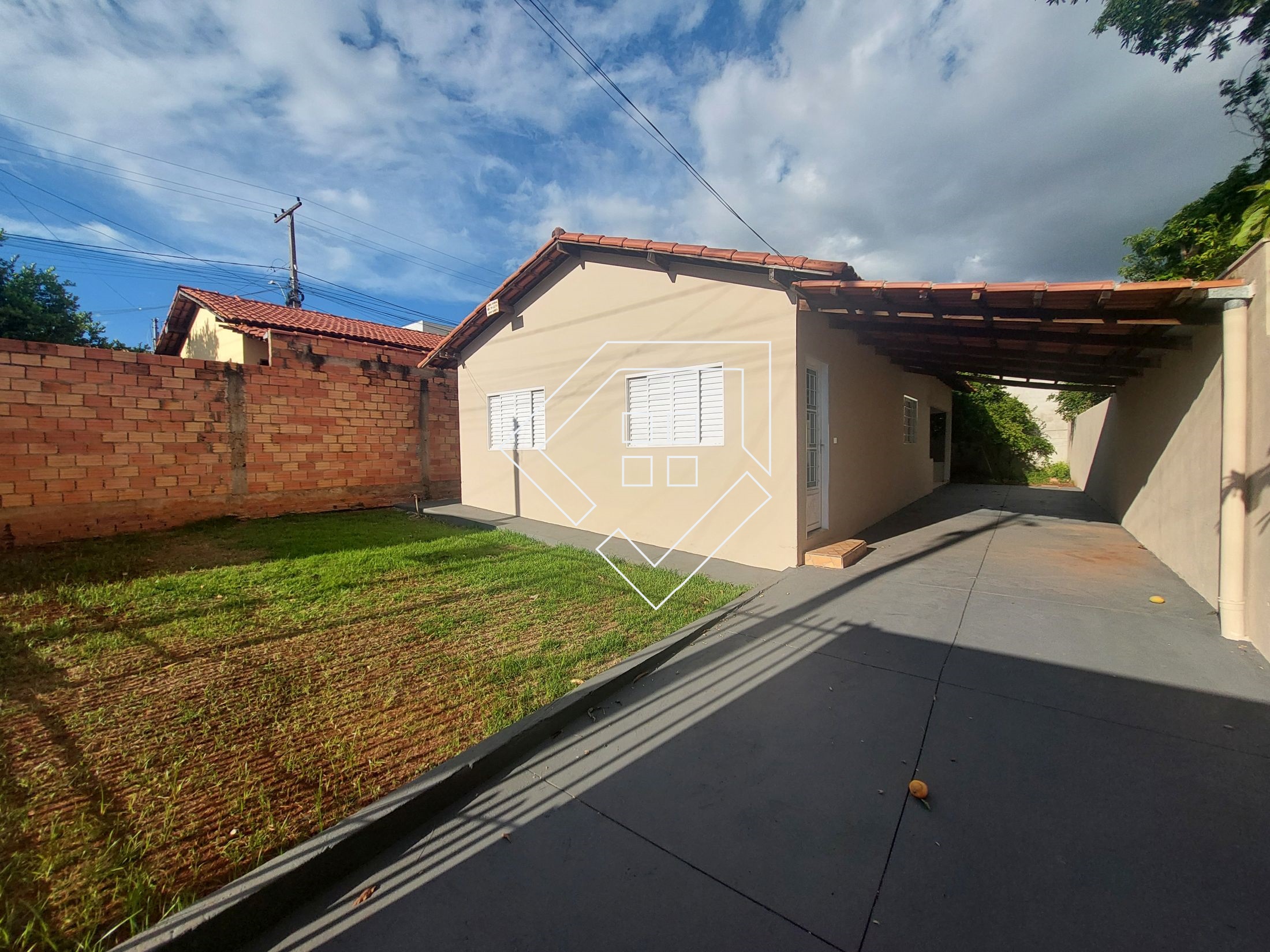 A casa contempla dois quartos, sala, cozinha com armários, banheiro social, ampla varanda com área de serviço, garagem coberta e quintal. Armários planejados na cozinha, jardim na frente, garagem para três veículos e uma ampla área ao lado de um quintal arborizado.