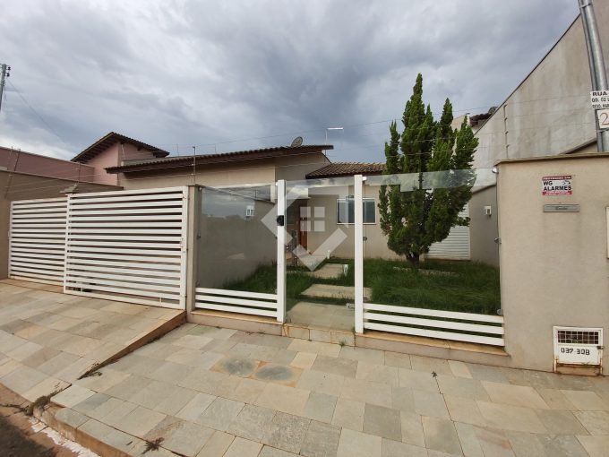 Casa a venda em Mineiros com três quartos sendo um suíte, sala, cozinha, sala de jantar, lavanderia com armários, edícula inacabada com despensa, garagem coberta para dois carros e uma vaga descoberta. Piso porcelanato, teto de laje com rebaixamento em gesso, vidros blindex e aquecimento solar.