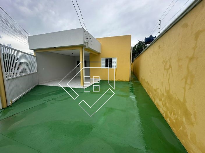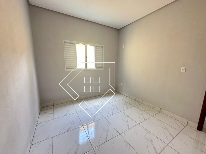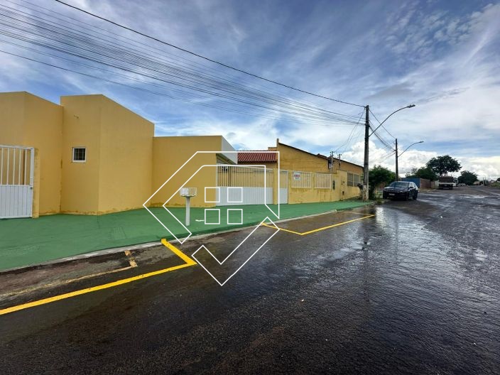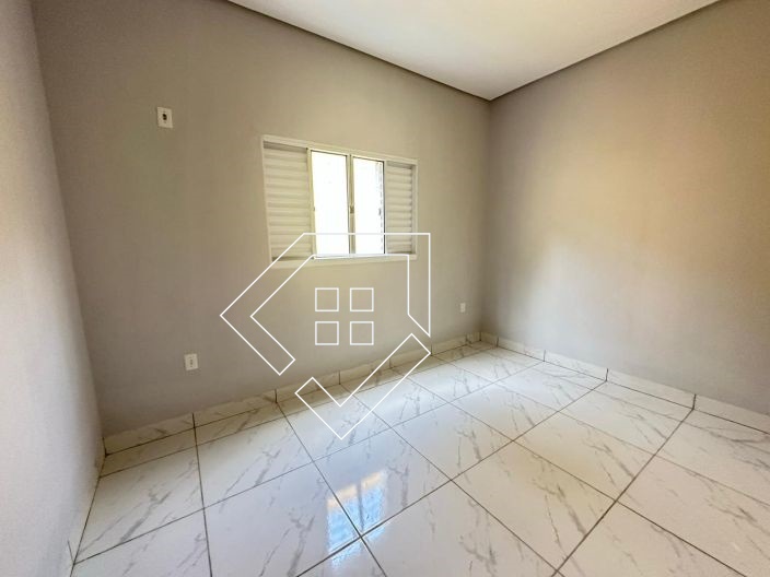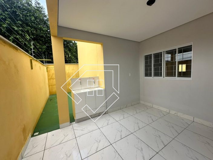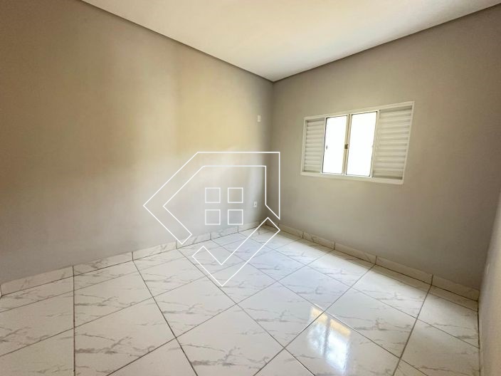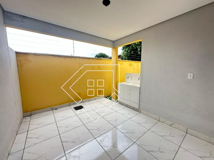 Casa par alugar em Mineiros-GO com três quartos, sala conj. cozinha, banheiro social, área de serviço e garagem coberta. Piso em Cerâmica e forro de gesso, quintal concretado.