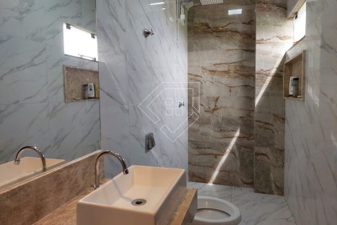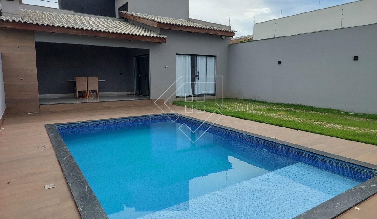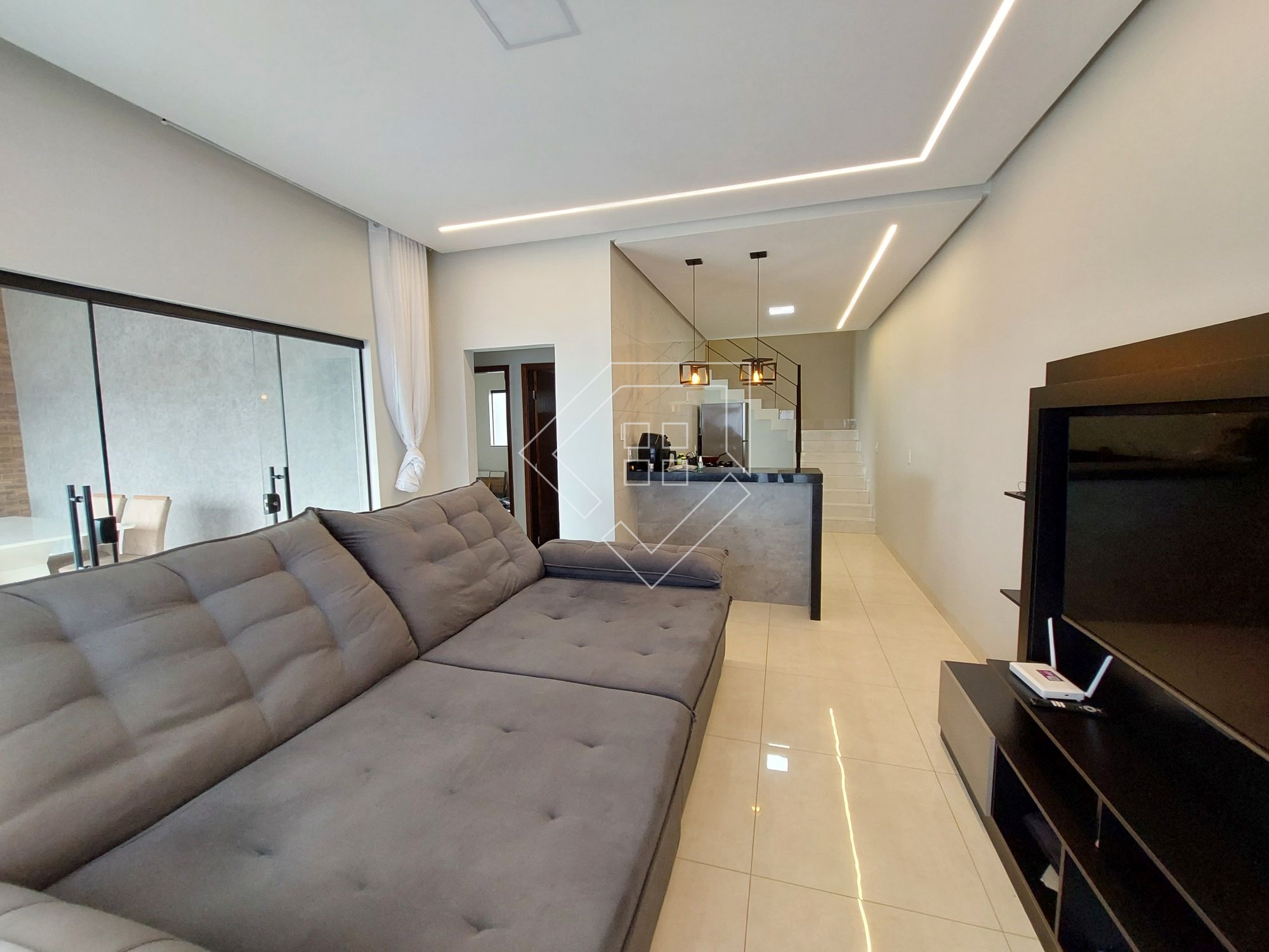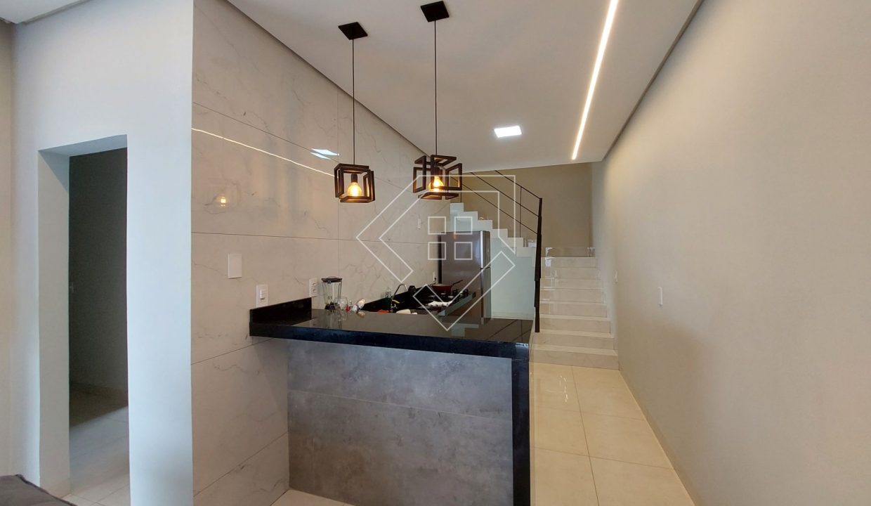 Casa a venda em Mineiros GO, com três quartos sendo um suíte, sala de estar, cozinha, banheiro social, varanda gourmet com churrasqueira, lavanderia e jardim com abrigo para carro. Suíte no piso superior com terraço e hidromassagem.