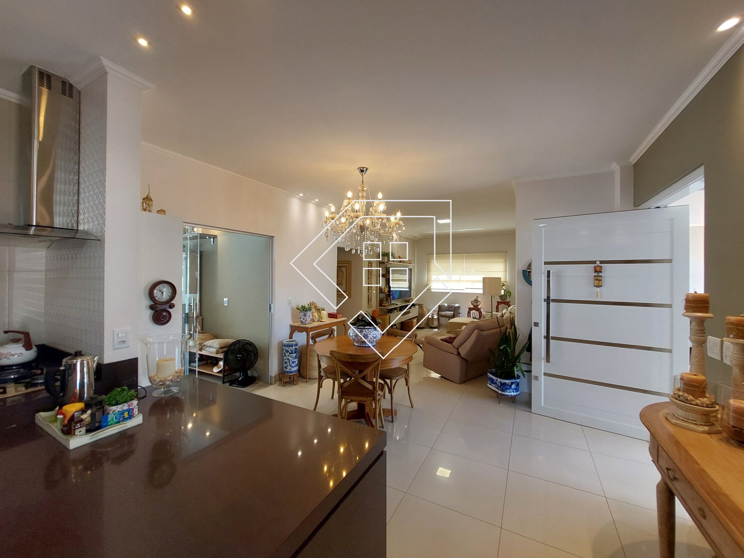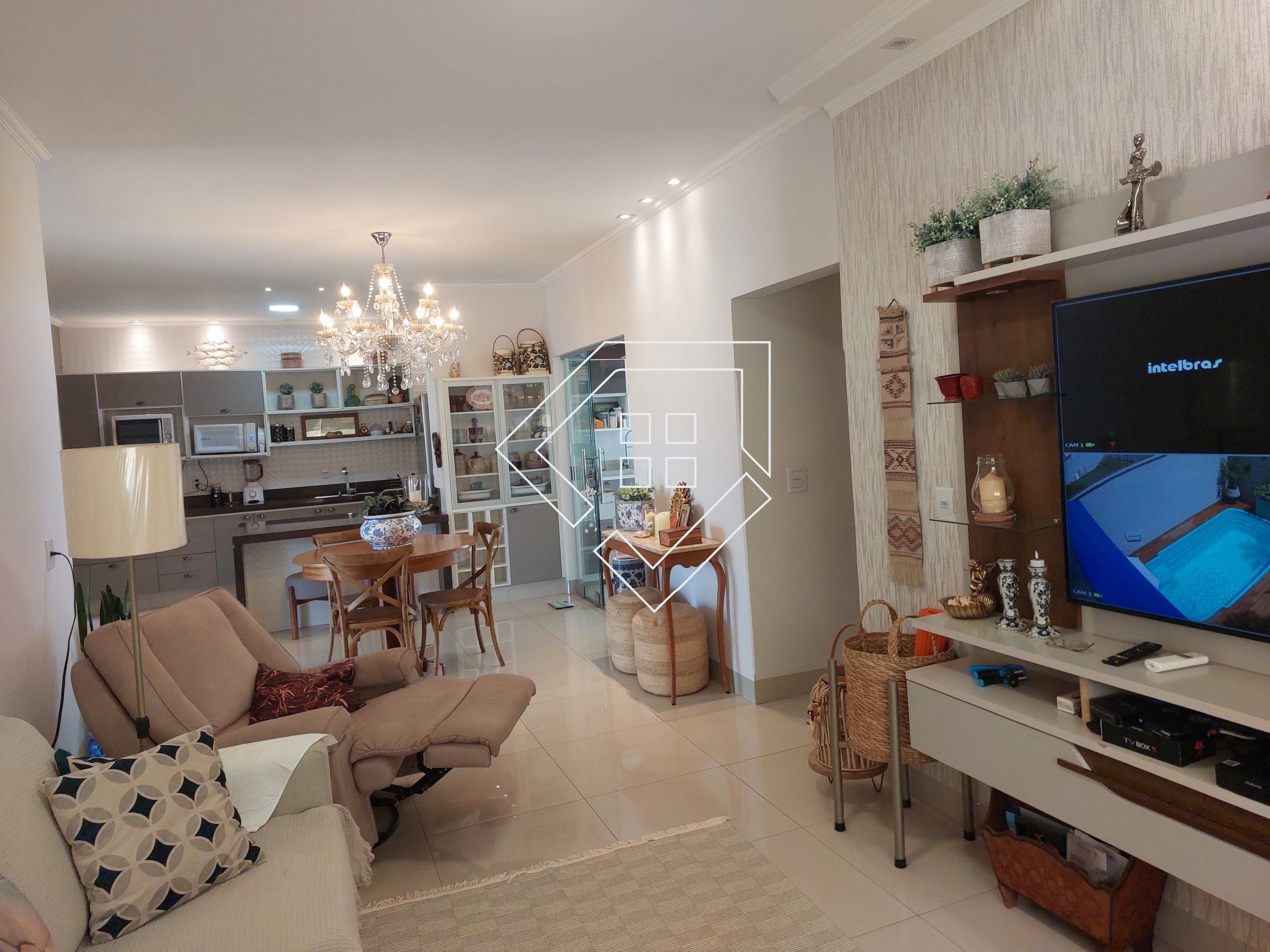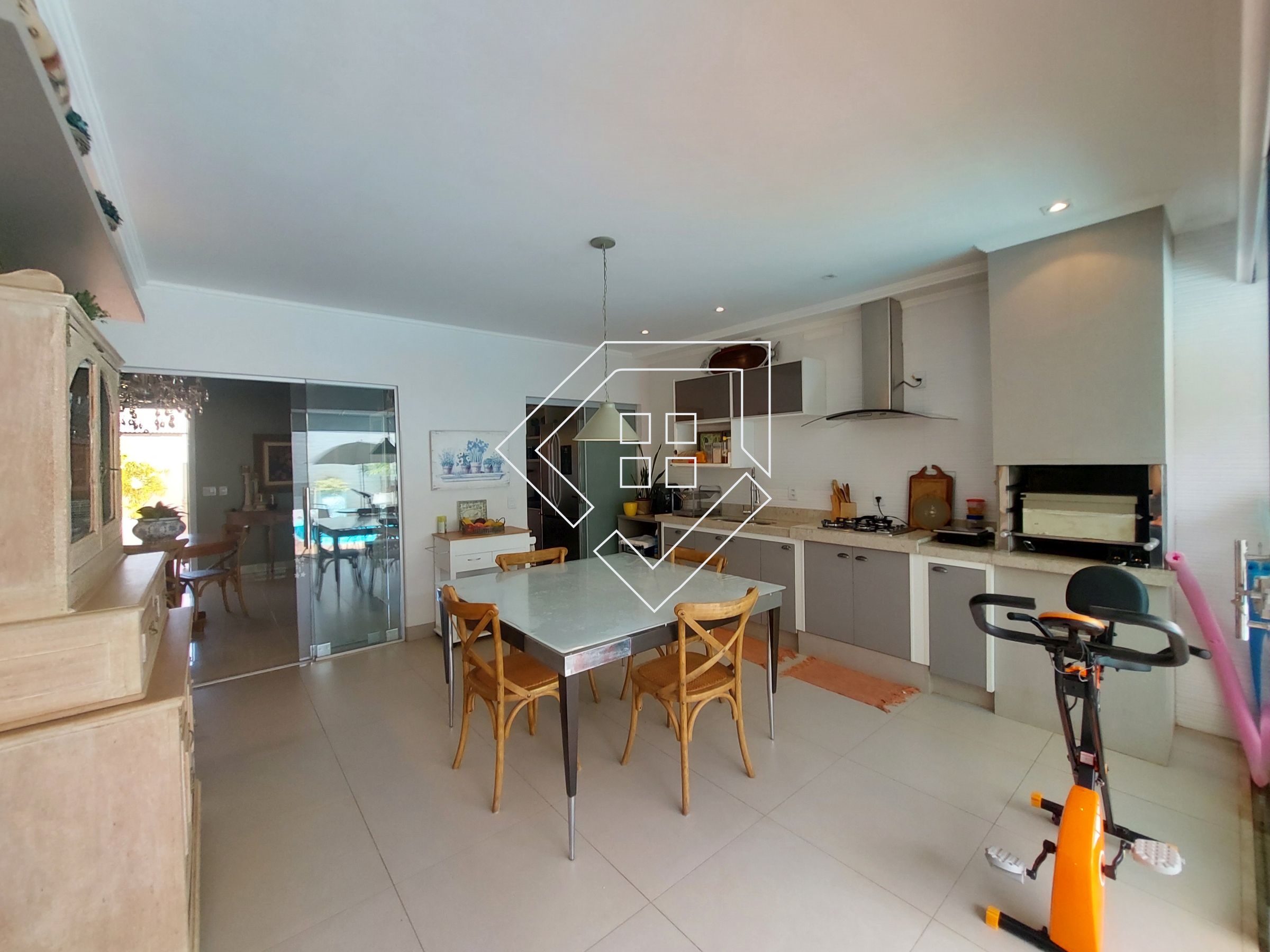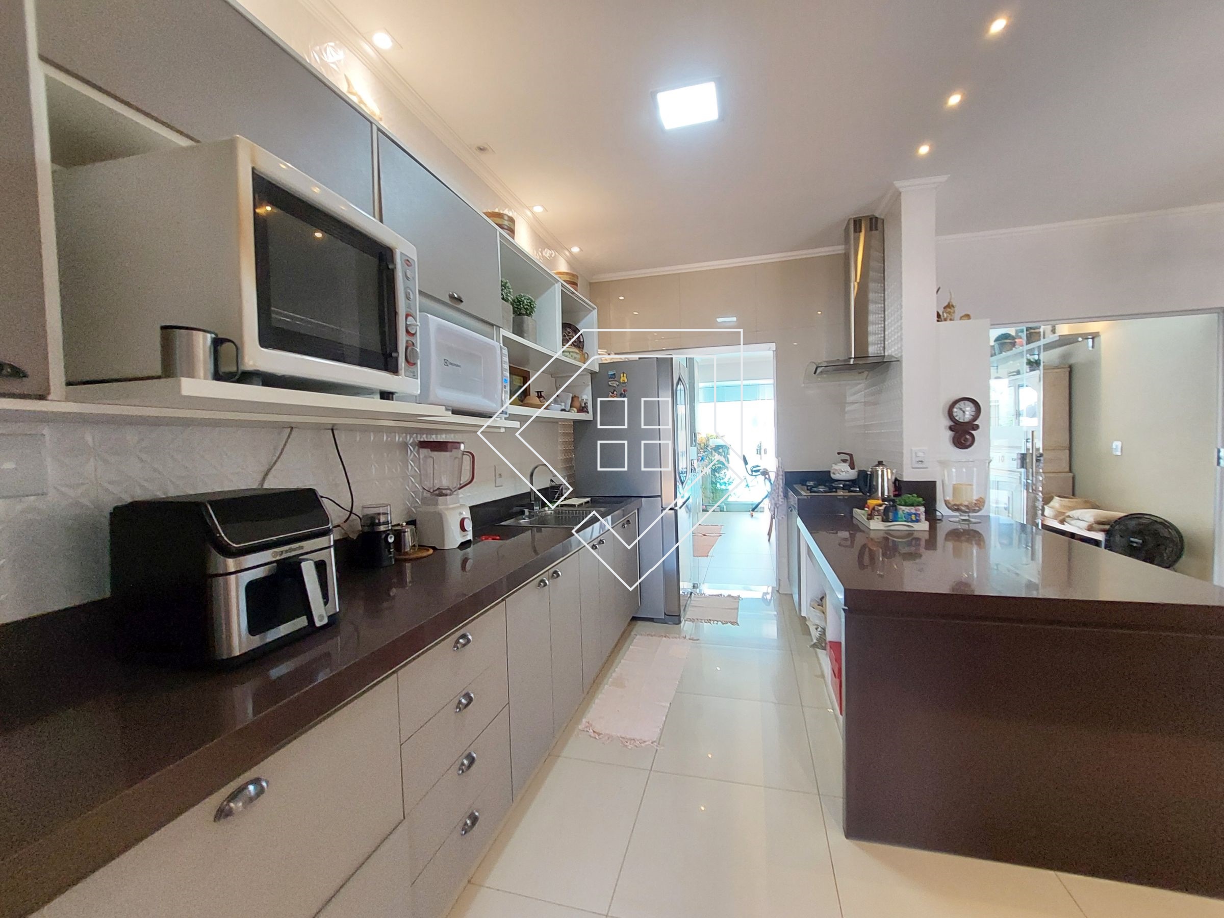 Casa com três quartos sendo um suíte com closet e banheira de hidromassagem, corredor, banheiro social, amplo living para ambiente de estar e jantar, cozinha, lavanderia independente, estendal, varanda gourmet com churrasqueira, lavabo, área de lazer com piscina, deck seco e ampla garagem.