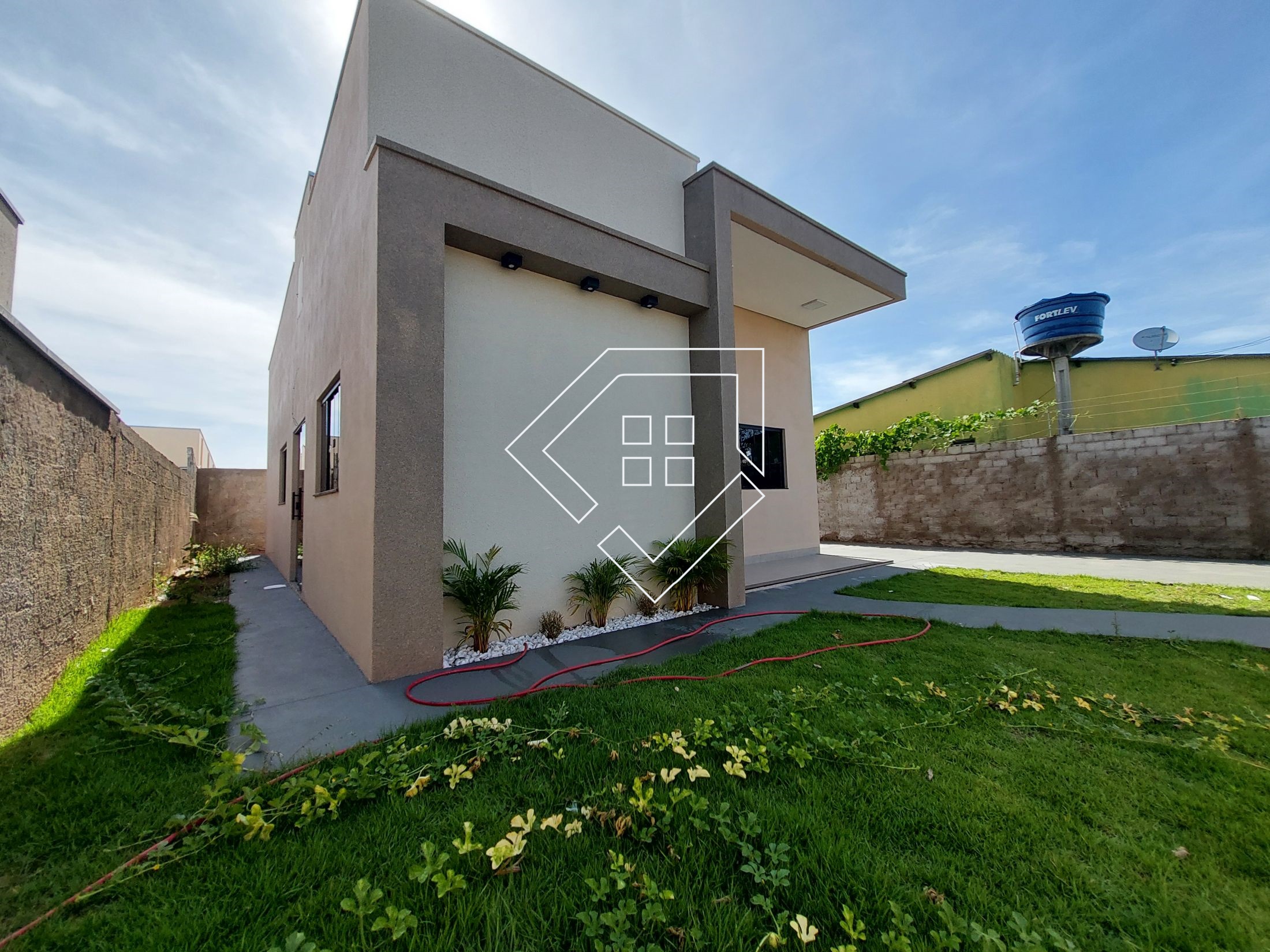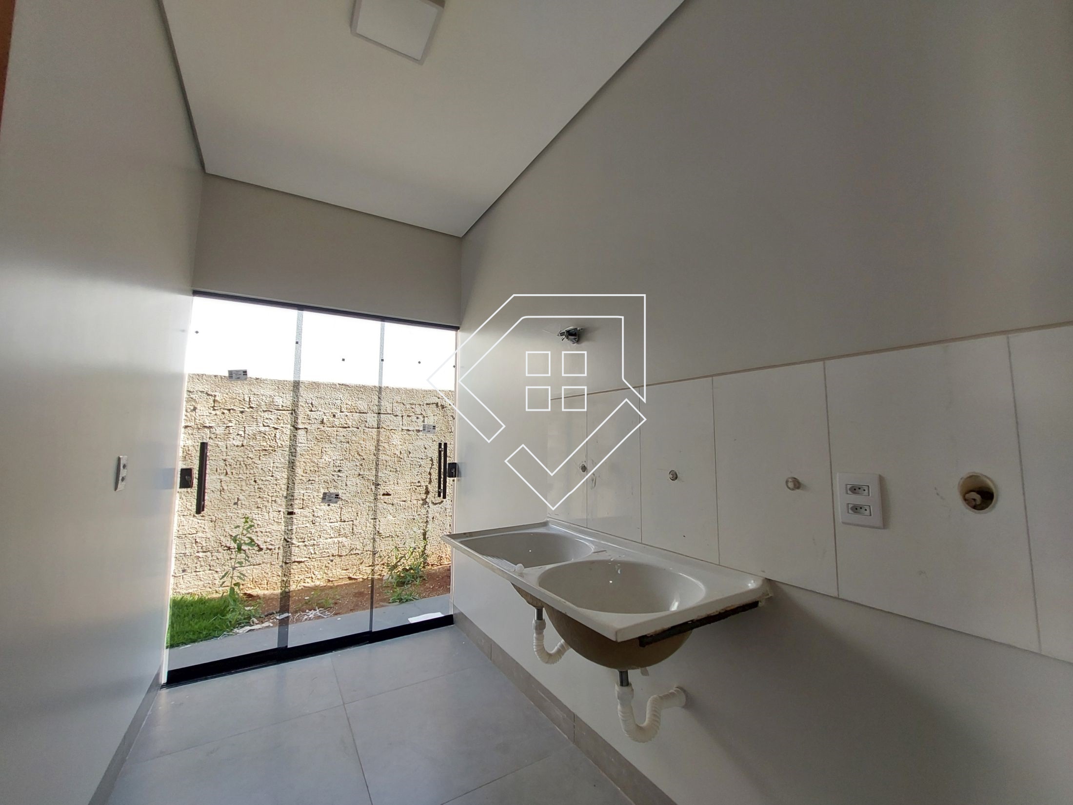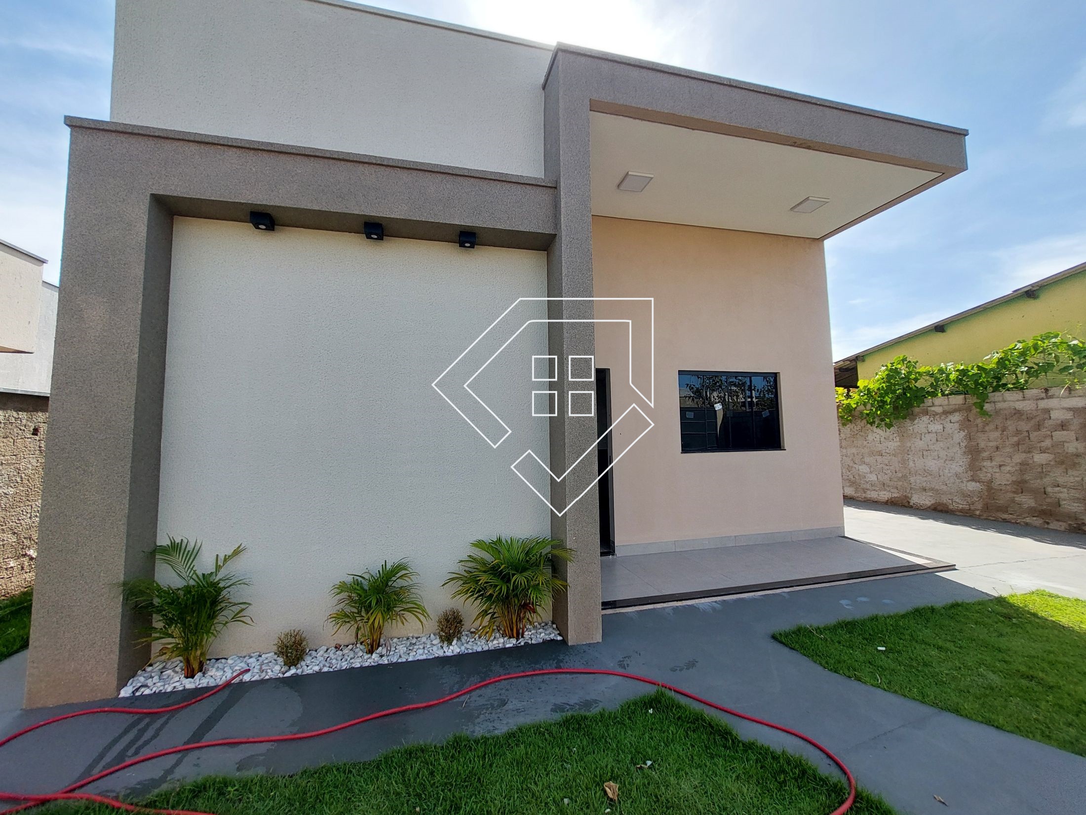 A casa contempla três quartos sendo um suíte, sala, cozinha americana, banheiro social e área de serviço. A área externa conta com jardim gramado na frente, calçada para abrigar até dois veículos e quintal aos fundos.