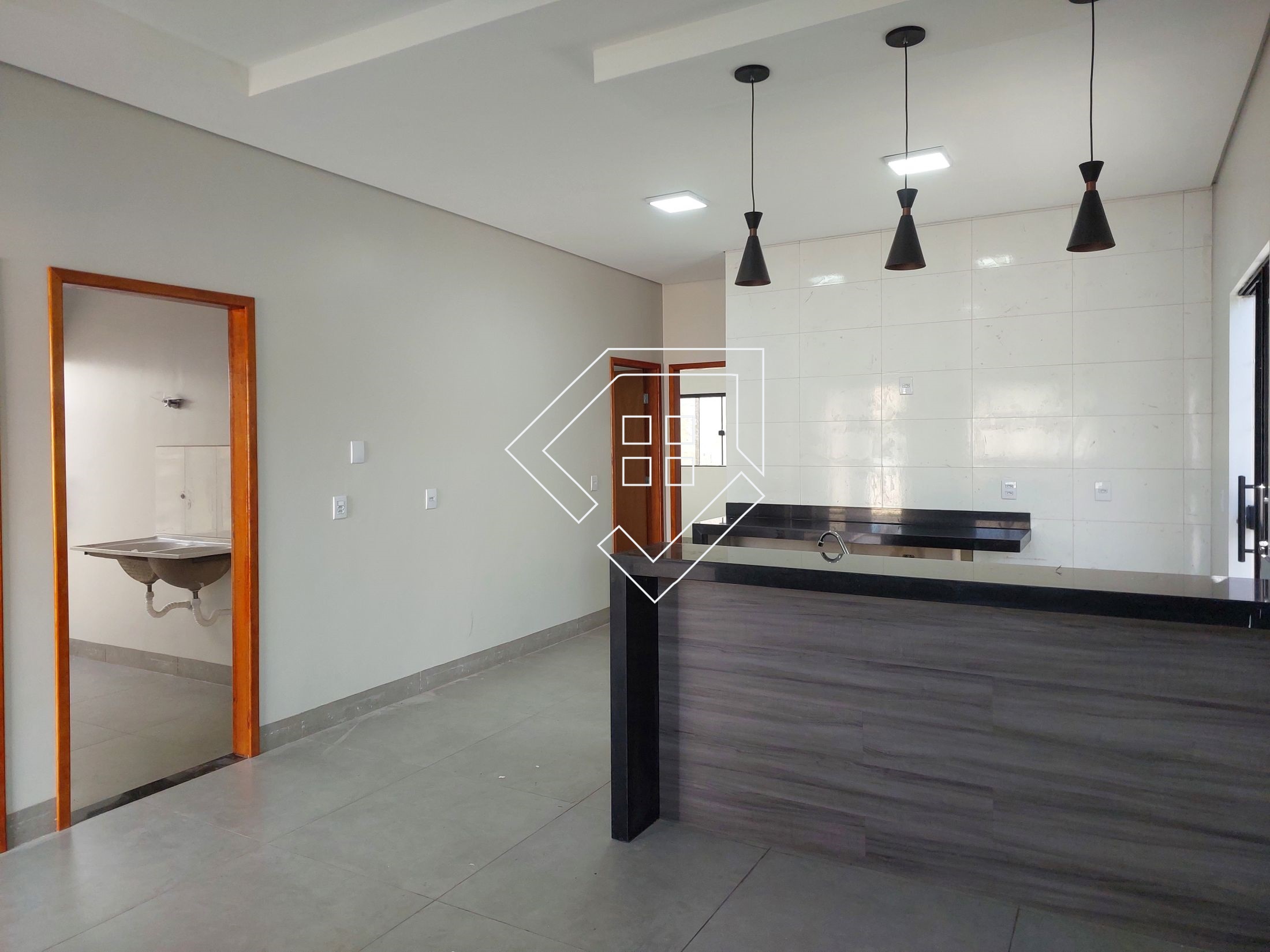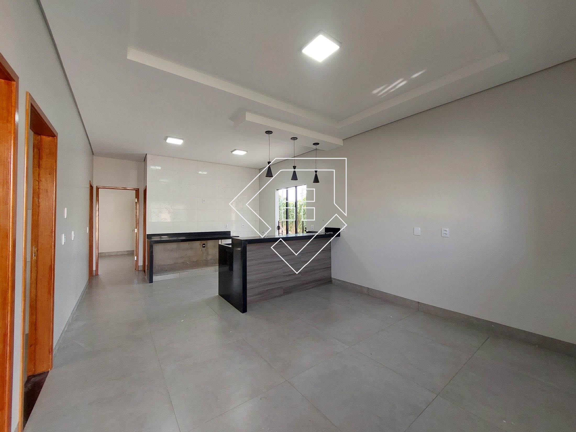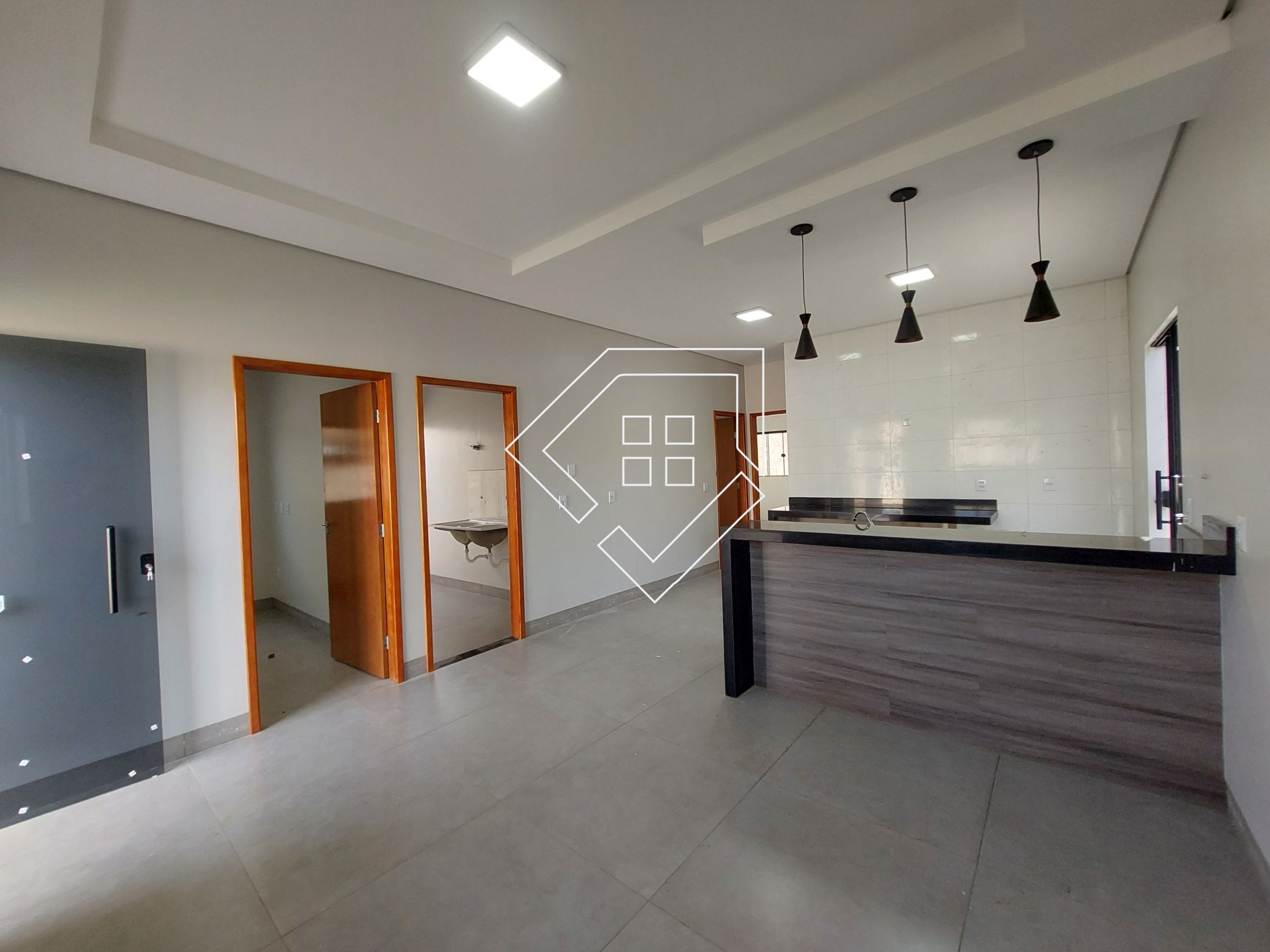 A casa contempla três quartos sendo um suíte, sala, cozinha americana, banheiro social e área de serviço. A área externa conta com jardim gramado na frente, calçada para abrigar até dois veículos e quintal aos fundos.