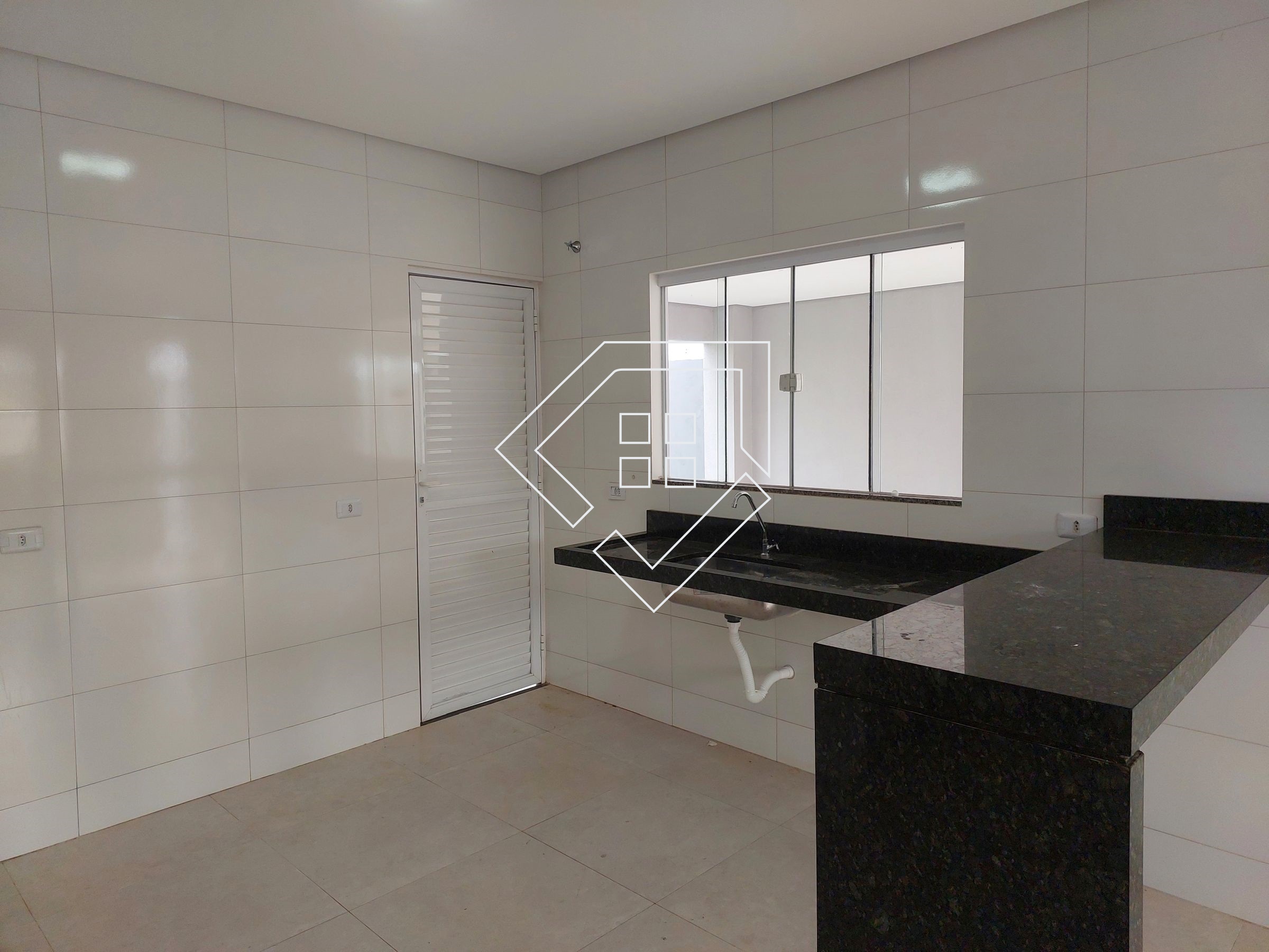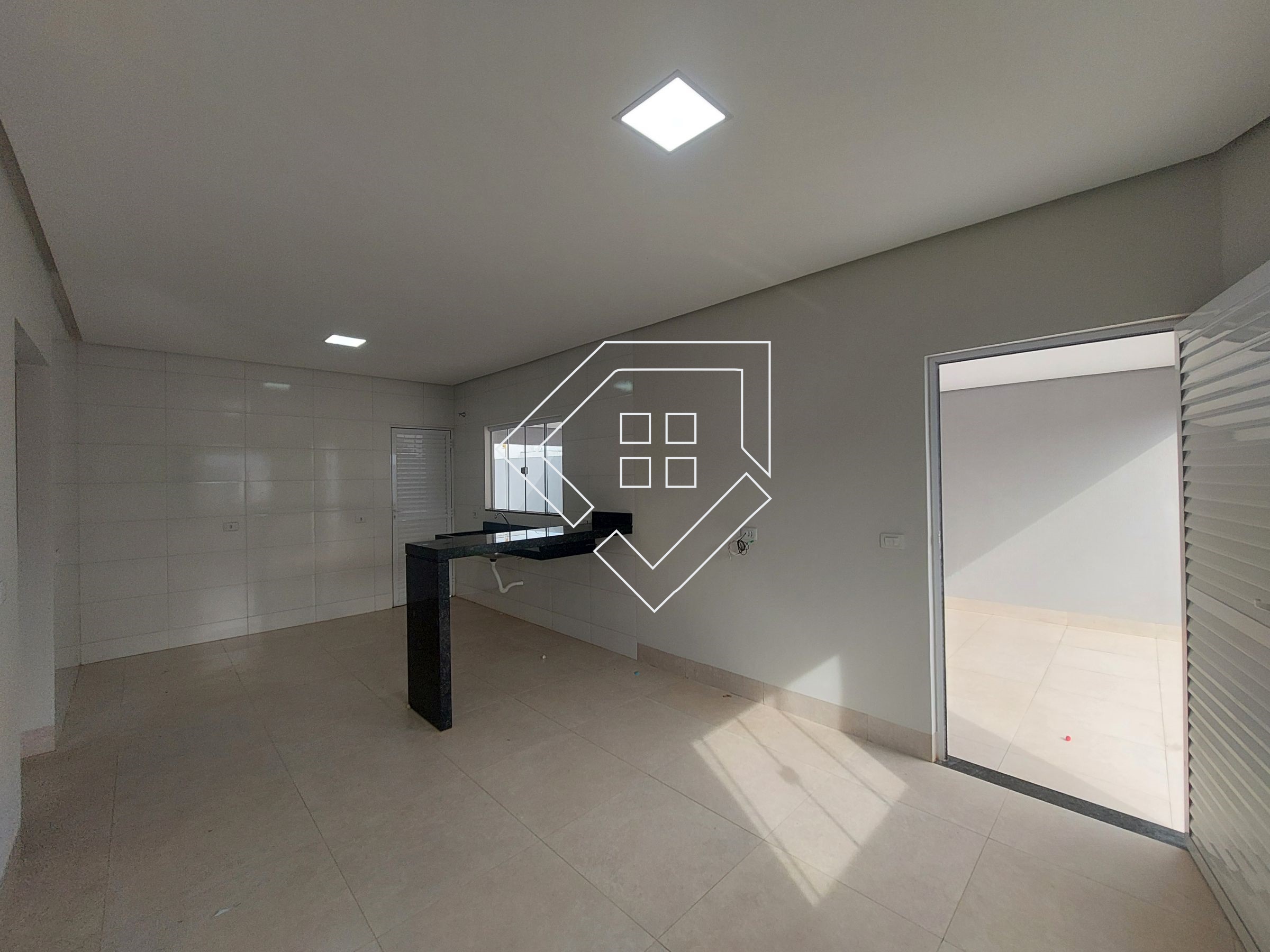 A casa contempla dois quartos sendo um suíte, sala, cozinha americana, banheiro social, área de serviço, garagem coberta e quintal gramado. Acabamento em forro de gesso e piso com porcelanato, portão eletrônico e cerca elétrica.